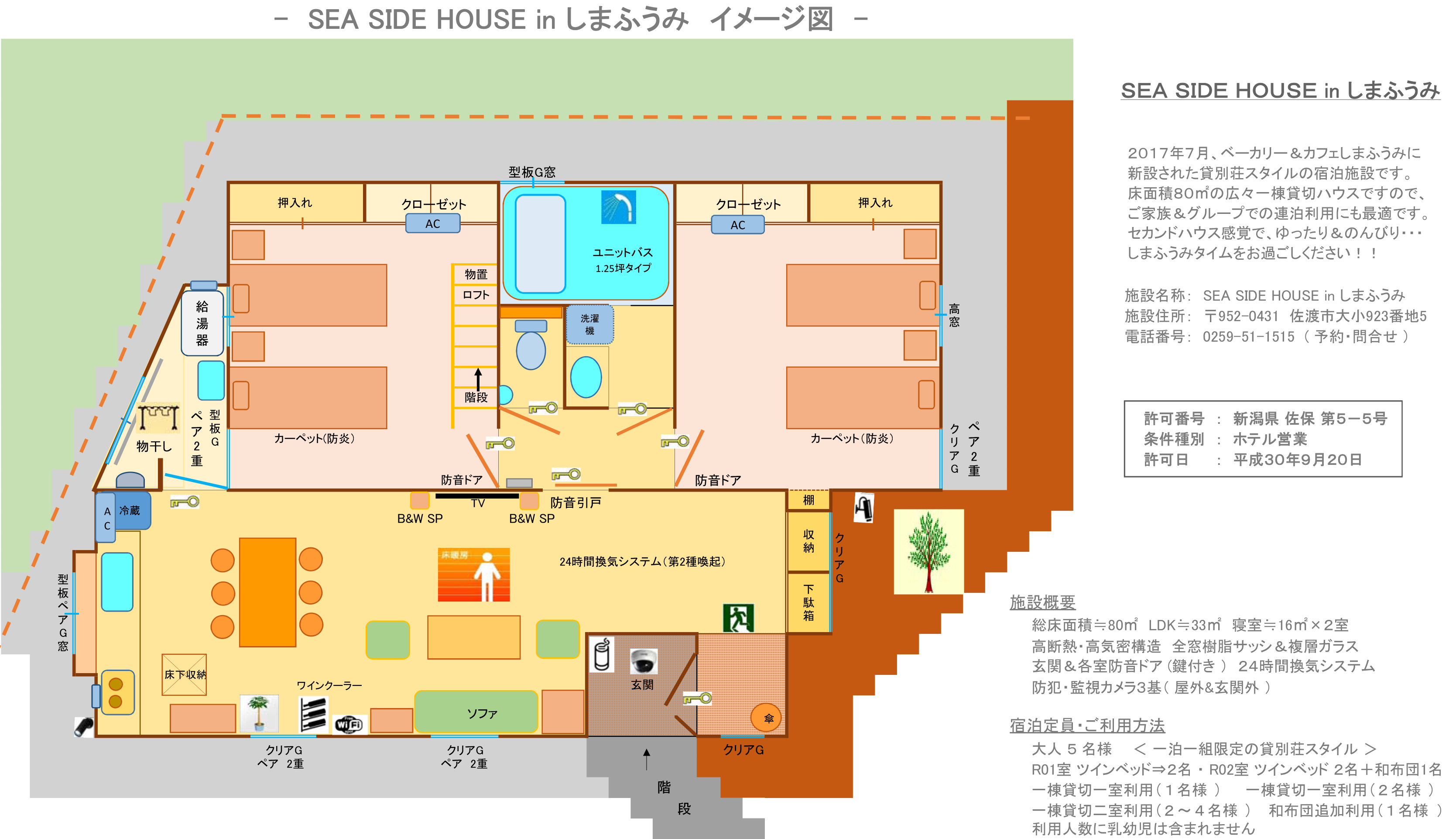 SEA SIDE HOUSE in しまふうみ 〒952-0431 新潟県佐渡市大小923番地5 ご予約・お問合せ:0259-51-1515 |